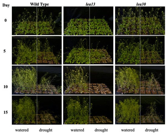 Tolerance to water deficit stress. Six-week-old plants were subjected to water stress, sampled at days 0, 5, 10, and 15 after cessation of irrigation, and analyzed for overall plant phenotype. The lea13 and lea30 lines showed greater susceptibility to water stress than the wild-type, which was more evident on day 10. Although all plants were planted and grown in the same space and conditions, the lea13 and lea30 lines showed a delay in development regardless of whether they received irrigation or drought, more pronounced in the lea13 line. Ten plants for each line were used as the experimental unit. Photographs were taken just in the drought stress (Left control plants were well-watered, and on the Right side are plants subjected to drought stress).