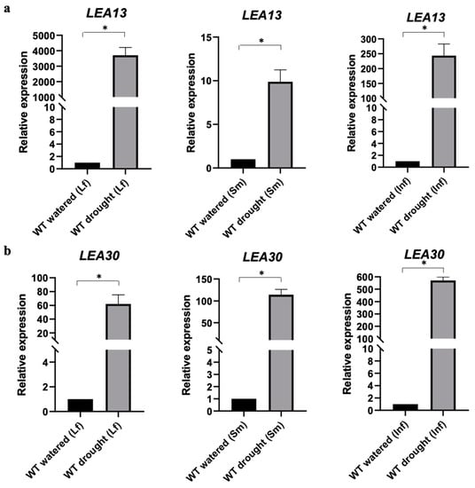 Quantitative RT-PCR analysis of LEA13 (a) and LEA30 (b) on water stress conditions. Wild-type plants of Arabidopsis thaliana were left without watering for ten days, then RNA samples were taken from rosette leaves. Abbreviations: WT (wild-type), Lf (rosette leaf), Sm (stem), and Inf (inflorescence). Y-axis: relative expression (2−ΔΔCT). * Data represent samples significantly different p < 0.05. All tests were performed using 3 biological and technical replicates.