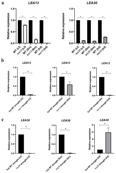 A qRT-PCR expression analysis was performed to determine the LEA13 and LEA30 expression in mutant genetic backgrounds. The relative expression LEA13 in the lea13 genetic background decreases significantly for leaf, stem, and inflorescence. The relative expression of LEA30 in the lea30 background also decreases significantly for leaf, stem, and inflorescence (Figure 4a). During drought (ten days after the plants stopped being irrigated), LEA13 expression decreased in lea13 background compared to wild-type (Figure 4b). LEA30 showed similar behavior; in leaf and stem, the expression in the mutant background decreased compared to the wild-type, while in inflorescences tissue, the expression increased (Figure 4c).