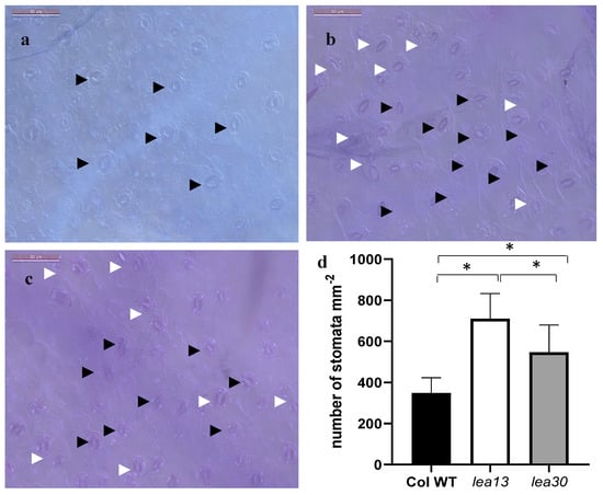 Stomatal density in lea13, lea30, and wild-type plants (a–c). Adaxial sides of cotyledons. Bar, 50 μm. (a) Wild-type. (b) lea13. (c) lea30. (d) Stomatal density is shown as the average number of stomata per square millimeter. Black arrowheads point mature stomata. White arrowheads point stomata clusters. Bars indicate standard deviation. * Data represent samples Col WT and lea13 significantly different p < 0.05. ** Data represent samples Col WT and lea30 significantly different p < 0.05.