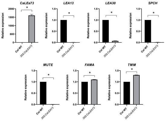 Arabidopsis plants overexpressing the CaLEA73 gene from the Capsicum annuum showed a phenotype of lower stomatal density and higher tolerance to hydric stress than wild-type plants [13]; this phenotype is the opposite to that observed in lea13 and lea30. To determine whether stomata development is affected when LEA protein levels are altered, the expression of cell fate marker genes SPCH, MUTE, FAMA, and TMM, in the stomata of rosette leaves in 35S:CaLEA73 was analyzed (Figure 7). The expression of LEA13 and LEA30 in 35S:CaLEA73 rosette leaves was repressed compared to wild-type. The expression pattern of SPCH and MUTE decreased significantly, but the expression of FAMA and TMM increased significantly in 35S:CaLEA73 (Figure 7). These results suggest that the formation of new stomata has been stopped and that the misregulation of LEA genes alters stomata development.
