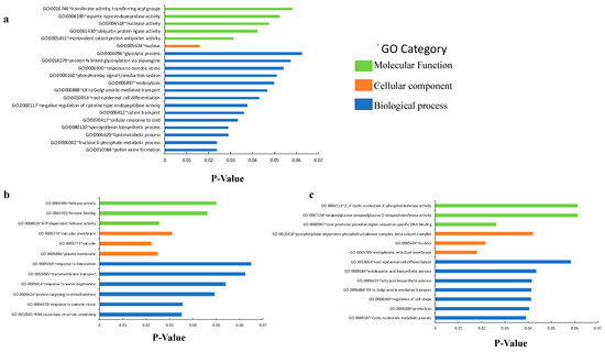 Significantly enriched Gene Ontology (GO) categories (biological process, cellular component, and molecular function): (a) associated with differentially expressed genes from lea13 microarray data, (b) associated with upregulated genes from lea13 microarray data, and (c) associated with downregulated genes from lea13 microarray data. Fisher Exact p-Value = 0 represents perfect enrichment. Usually, p-Value is equal to or smaller than 0.05 to be considered strongly enriched in the annotation categories.