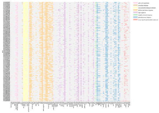 Cis-elements in the promoters of GhACOs. The cis-elements with similar functions are shown in the same blocks with the same color.