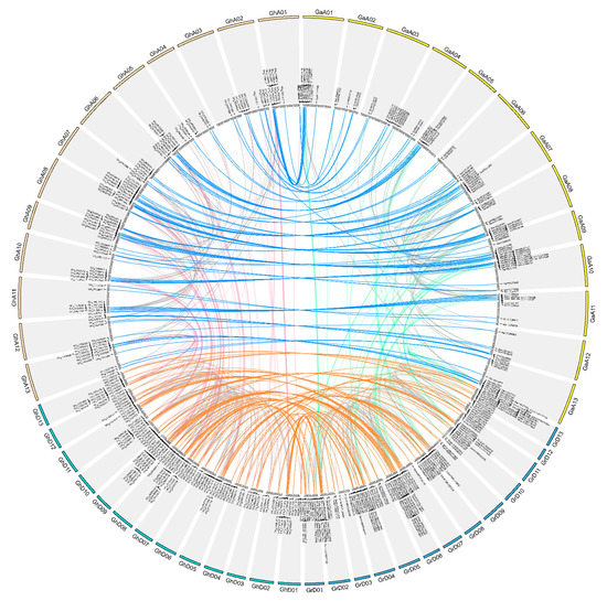 Collinear ACO gene pairs in cotton. Yellow, blue, orange, and green represent the chromosomes of Ga, Gr, and the At and Dt subgenomes of Gh, respectively. Gray lines represent intragenomic gene pairs, while other colors represent intergenomic gene pairs.