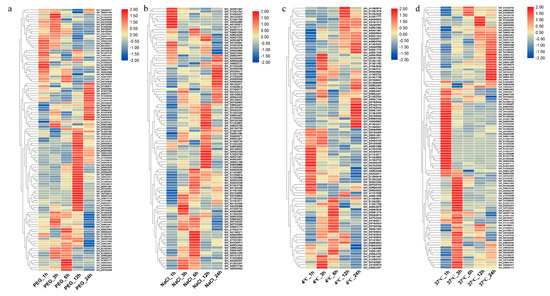 Expression patterns of GhACOs under drought, salt, cold, and heat stresses, (a): drought stress condition, (b): salt stress condition, (c): cold stress condition, (d): heat stress condition.