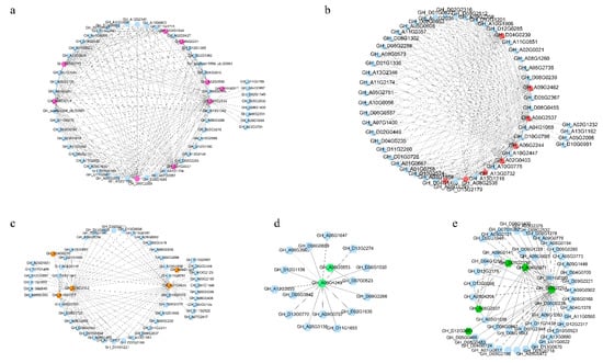 Co-expression networks of GhACOs. (a–e) Representative modules. Pink, red, orange, and green circles are GhACOs, and blue circles are the genes co-expressed with GhACOs.
