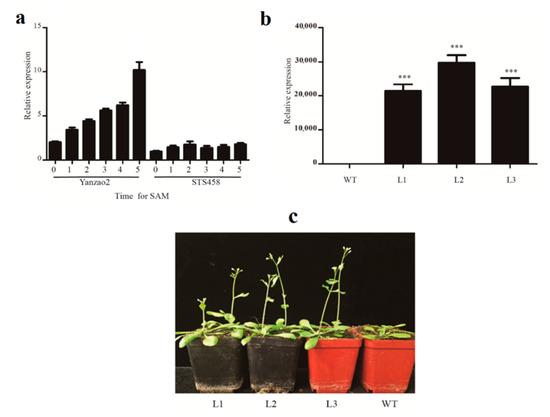 By analyzing the transcriptome data of upland cotton at different stages of maturation [38], we found that GhACO106_At (GH_A09G0769) showed clear differences in expression in early-maturing and late-maturing cotton varieties. In this research, the expression characteristics of GhACO106_At were further confirmed by qRT-PCR. The qRT-PCR results showed that the expression level of GhACO106_At in the early-maturing variety (Yanzao2) was higher than that in the late-maturing variety (STS458) at the same developmental stages. Furthermore, the expression level of GhACO106_At increased with the development of flower bud differentiation in Yanzao2 but showed no significant change in STS458 (Figure 5a).