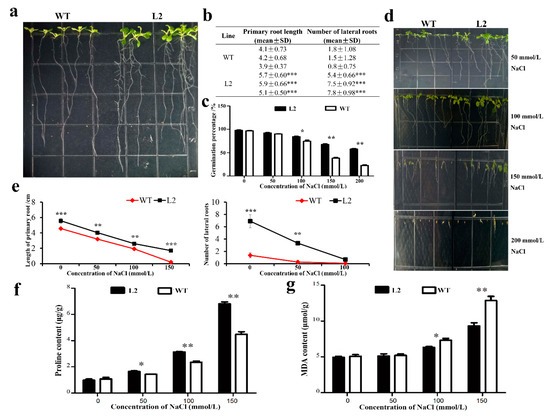 GhACO106_At increased salt stress tolerance in transgenic Arabidopsis. (a) Root phenotype of 8-day-old WT and L2 transgenic seedlings; (b) statistical data of primary roots and lateral roots of WT and L2 transgenic seedlings; (c) seed germination rate of WT and L2 transgenic seedlings under control and various NaCl treatments; (d) root phenotypes of 8-day-old WT and L2 transgenic seedlings under various NaCl treatments; (e) primary root lengths and the number of lateral roots of WT and L2 transgenic seedlings under control and various NaCl treatments; (f) proline contents of WT and L2 transgenic seedlings under control and various NaCl treatments; (g) MDA contents of WT and L2 transgenic seedlings under control and various NaCl treatments. L2: transgenic line, WT: wild type. Student’s t-test: * p < 0.05; ** p < 0.01; *** p < 0.001.