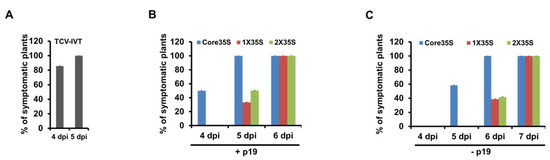 Symptom expression of the wildtype TCV on N. benthamiana. (A) Symptom expression (%) with rub inoculation method using in vitro transcript (IVT) of wtTCV. (B) Symptom expression (%) with agroinfiltrated delivery of three different promoter-based wt TCV constructs; Core35SwtTCV, 1X35SwtTCV, and 2X35SwtTCV, along with p19-expressing construct onto leaves of healthy N. benthamiana plants. (C) Symptom expression (%) with agroinfiltration method using three different promoter-based wt TCV constructs without p19.