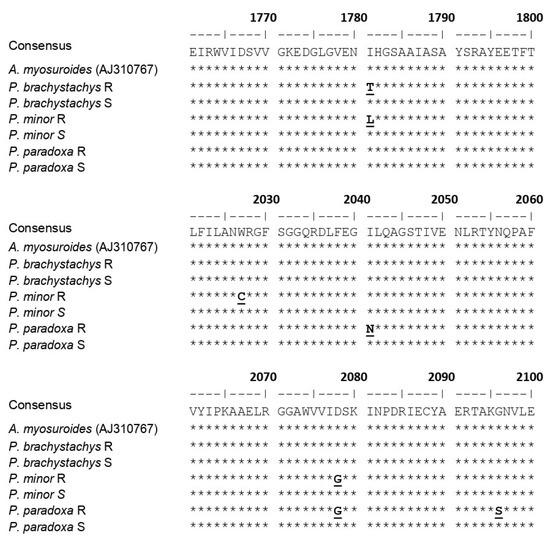 CT-domain sequencing of the ACCase gene revealed the occurrence of several amino acid substitutions in the R biotypes of Phalaris spp., all of them associated with resistance to ACCase-inhibiting herbicides at the target site level (Figure 2). The amino acid substitutions found in the R biotypes were Ile-1781-Leu (L) or Thr (T), Trp-2027-Cys (C), Ile-2041-Asn (N), Asp-2078-Gly (G), and Gly-2096-Ser (S). In P. brachystachys, only the substitution of Thr for Ile at position 1781 was found. P. minor showed Ile-1781-Leu, Trp-2027-Cys, and Asp-2078-Gly substitutions, while P. paradoxa showed the substitutions of Ile-2041-Asn, Asp-2078-Gly, and Gly-2096-Ser.