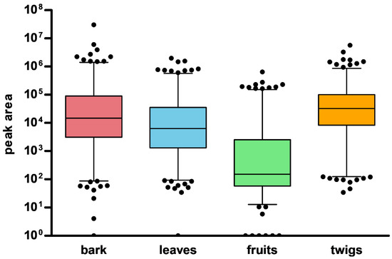 The 427 nodes were generated from the positive mode, whereas 189 nodes were generated from the negative mode. Additionally, the different parts showed different patterns of the nodes corresponding to the peaks in the chromatograms (Figure 1). The peaks from the fruits had significantly lower intensities in both ionization modes compared to the other parts. Next, we inspected the distribution of the nodes from each part using a combination of MN methods.