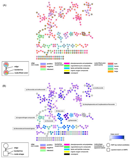 The MN was used to confirm the propagation of in silico annotation with Network Annotation Propagation (NAP) (https://proteomics2.ucsd.edu/ProteoSAFe/?params=%7B%22workflow%22:%22NAP_CCMS2%22%7D (accessed on 8 July 2020)) [16] using the following parameters: the 10 first candidates were used for consensus score and 10 ppm accuracy for the exact mass candidate search. Finally, we used the GNPS, DNP, SUPNAT, and DRUGBANK structural databases.