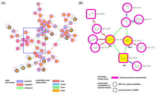 (A) Molecular network of the biggest cluster annotated as “flavonoids and isoflavonoids” in Figure 2. (B) NAP results of the nodes of the blue rectangle in (A); NI-i (annotated as dicyclokuwanon EA), NI-ii (annotated as kuwanon T) and PI-i (connected to NI-i and NI-ii).