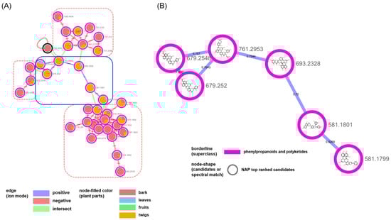 (A) Molecular network of the cluster annotated as “diarylheptanoids and 2-arylbenzofuran flavonoids” in Figure 2. (B) NAP results of nodes of the blue rounded rectangle in (A).