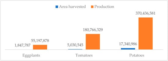 Harvested areas (hectares) and production (tonnes) of eggplant, potato, and tomato in 2019. Source: [13].