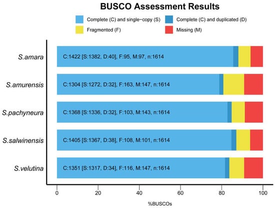 We generated 80.0–92.1 million reads per species, yielding 12.0–13.8 Giga-base (Gb) of RNA-seq data per species. After quality control, 79.8–92.0 million reads per species remained, consisting of 11.7–13.6 Gb clean data per species (Supplementary Table S2). De novo assembly yielded 176,265–270,778 transcripts with 151.5–237.3 million base and 91,980–147,303 unigenes with 65.9–87.5 million base, respectively. The median length of transcripts was 417 bp–611 bp (mean length: 646.45 bp–967.28 bp), and the median length of unigenes was 353 bp–427 bp (mean length: 574.69 bp–763.58 bp), with contig N50s ranging from 899 bp to 1562 bp for transcripts and from 787 bp to 1334 bp for unigenes (Table 1). BUSCO results showed that the completeness of de novo assembly reached 88.1%, 80.8%, 84.8%, 87.1%, and 83.7% for S. amara, S. amurensis, S. pachyneura, S. salwinensis, and S. velutina, respectively (Figure 1), suggesting high-level quality.
