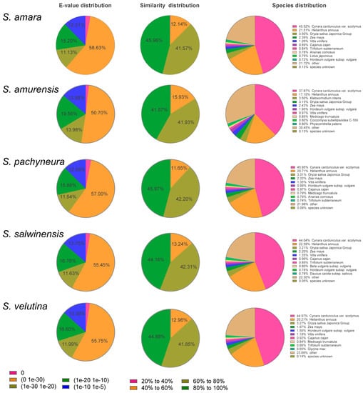 The proportion of the unigenes of S. amara, S. amurensis, S. pachyneura, S. salwinensis, and S. velutina annotated to NCBI non-redundant protein database. For species distributions, the top 10 matched species are provided.