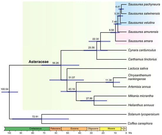 A total of 1136 single-copy orthologous genes were used for phylogenetic reconstruction. The resulting phylogeny (Figure 3) is consistent with known phylogenetic relationships within Asteraceae. The topology shows that the two lowland species form a clade and together are sisters to the three alpine species. Among the alpine species, S. velutina is sister to S. pachyneura and S. salwinensis (Figure 3). According to the MCMCTree analysis, the crown group of Saussurea diverged at ca. 9.50 million years ago (Mya) (95% highest posterior density (HPD): 6.08–13.76 Mya), and all Saussurea species are estimated to have originated in the late Miocene to the early Pliocene (4.41–9.50 Mya). The divergence time between Saussurea and Cynara is estimated to be ca. 22.30 Mya (95% HPD: 13.95–32.37 Mya). The divergence time of Asteraceae species is estimated to diverge at ca. 56.26 Mya (95% HPD: 40.70–72.81 Mya) (Figure 3).
