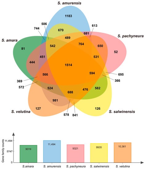 Gene family comparison among five Saussurea species. Numbers on the graph represent the count of gene families. Gene Ontology (GO) enrichment for lineage-specific gene families of three alpine species (S. pachyneura, S. salwinensis, and S. velutina) are provided in Table 3.
