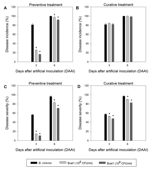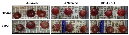 2.4. Preventive and Curative Action of Strain Bvel1 against B. cinerea on Grape Berries