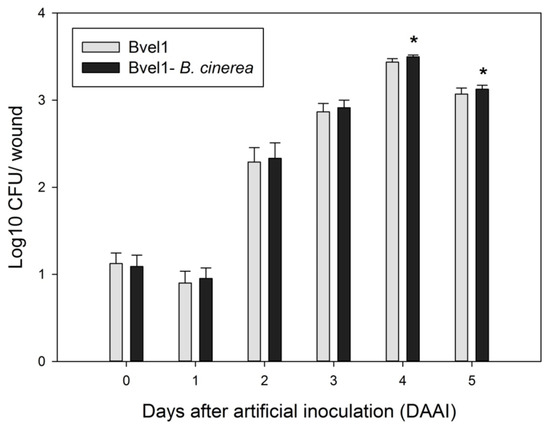 4.2. In Vitro Antagonistic Activity of Bacillus velezensis Bvel1 against B. cinerea