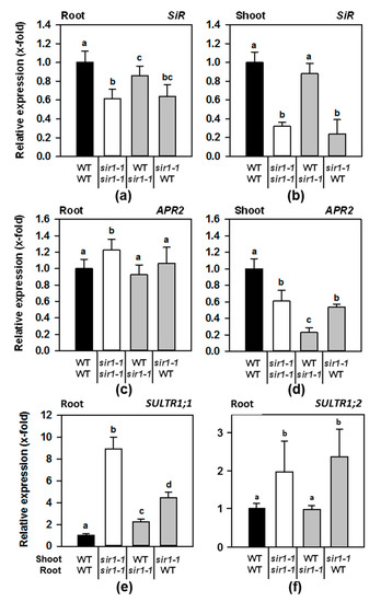 Indeed, sir1-1/sir1-1 plants confirmed the substantial accumulation of sulfate in the shoots of soil-grown sir1-1 plants. This increase also occurred when SIR activity was depleted in shoots of sir1-1/WT grafts. However, the decrease of SiR in the roots of WT/sir1-1 did not result in sulfate accumulation in the scion when compared to WT/WT (Figure 3b). The shoot-specific accumulation of sulfate correlated with the induction of the high-affinity sulfate uptake systems in roots if the scion had a sir1-1- background (Figure 2e,f).