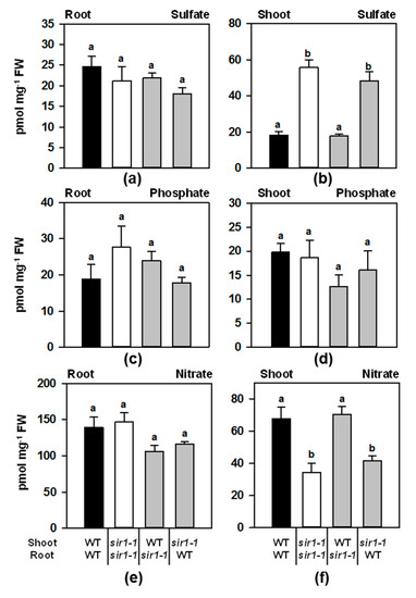 Thus, the anion concentration pattern in the organs of micrografted plants appears to be strictly dependent on the shoot genetic background, with the specific accumulation of sulfate and decreased nitrate in the shoots of sir1-1 background. On the contrary, the depletion of sulfur reduction in the roots of WT/sir1-1 or sir1-1/sir1-1 has no significant influence on macronutrient accumulation in the shoot.