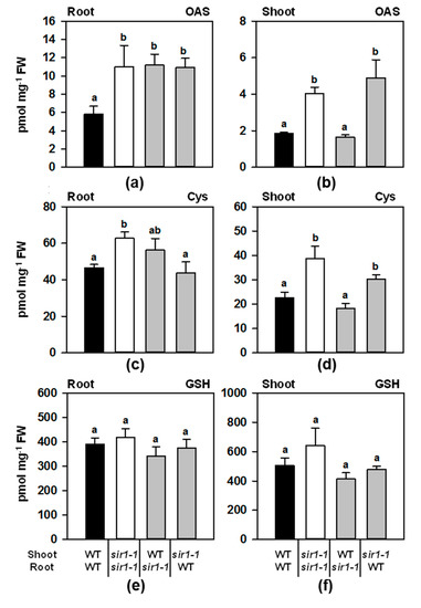 The cysteine precursor O-acetylserine (OAS) is intensively discussed as a signal for the expression of many genes related to sulfur metabolism [15]. The sir1-1 mutant is characterized by an increased OAS concentration due to the limited flux into cysteine and also an impact on the thiol steady-state level [12]. OAS was found to be increased in the roots of all the grafting combinations (1.9-fold) compared to the WT/WT homografts (Figure 4a). In the shoot, OAS was 2.2-fold accumulated in sir1-1/sir1-1 homografts, thus well reflecting the situation in soil-grown non-grafted sir1-1 mutant plants [12]. It was unchanged in the WT/sir1-1 combination and accumulated 2.6-fold in the sir1-1/WT combination (Figure 4b). Thus, the sir1-1 mutation caused the shoot to accumulate OAS even when grafted on a WT root.