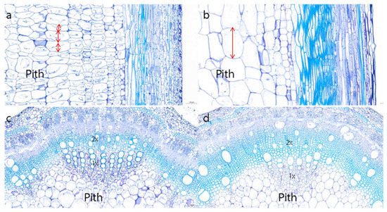 Preparation of paraffin sections: Samples were fixed with a mixture of formaldehyde, acetic acid, and ethanol (FAA) for 48 h [51] and then transferred to ethanol for stepwise dehydration, after which paraffin sections were prepared. The sections were stained with toluidine blue and observed under an upright optical microscope (Nikon Eclipse E100, Tokyo, Japan), and images were taken with an imaging system (Nikon DS-U3, Tokyo, Japan).