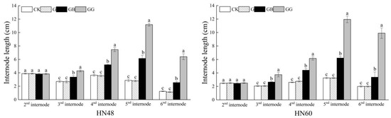 Figure 2 shows the changes in internode length after GA3 was applied to different parts of soybean plants after girding. The two cultivars showed the same pattern. The length of the second internode did not differ significantly between the treatments. However, the lengths of the third, fourth, fifth, and sixth internodes of plants in the GG treatment were significantly greater than those in the other three treatments. The lengths of the third, fourth, fifth, or sixth internodes of the plants in the GB treatment were significantly greater than those of the plants in the G or CK treatment, while the length of the internodes of plants in the CK and G treatments did not significantly differ.