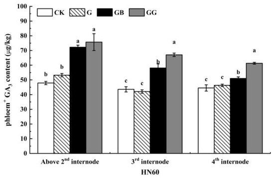 A comparison of the GA3 content in the phloem+ of plants among the four treatments showed a higher phloem+ GA3 content in the upper part of the second internode of the plants in the GG treatment compared with the GB treatment, but the results of the two treatment groups did not differ significantly. Compared with those in the G and CK treatments, the plants in the GG and GB treatments presented significantly higher phloem+ GA3 contents, while the content in the plants in the G treatment and CK treatment did not differ significantly. In terms of the phloem+ GA3 content in the third and fourth internodes of plants, compared with the GB, G, and CK treatments, the GG treatment resulted in significantly higher levels, and compared with the G and CK treatments, the GB treatment resulted in significantly higher levels; however, the contents did not differ significantly between the G treatment and the CK treatment. Taken together, these results showed that the application of GA3 to the xylem and stem cortex increased the GA3 content in the phloem+ of the internodes above the girding site, indicating that GA3 in the stem was transported in both directions through the xylem and phloem. Combining the results shown in Figure 2 and Figure 3, we found that the pattern of changes in internode length was essentially consistent with the pattern of changes in GA3 content, indicating that the GA3 content in the stem is an important factor affecting stem elongation.