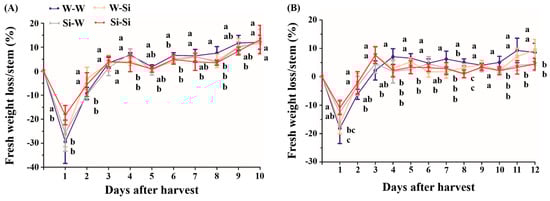 Chicago/Turabian StyleSong, Jinnan, Yali Li, Jiangtao Hu, Jaehyeok Lee, and Byoung Ryong Jeong. 2021. "Pre- and/or Postharvest Silicon Application Prolongs the Vase Life and Enhances the Quality of Cut Peony (Paeonia lactiflora Pall.) Flowers" Plants 10, no. 8: 1742. https://doi.org/10.3390/plants10081742