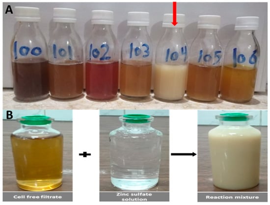 Seven actinobacterial isolates coded as MK-100–106 were isolated from soil samples and screened for the biogenic synthesis of ZnO-NPs. Visual observation of the reaction mixture of cell-free filtrate (CFF) and zinc sulfate solutions was used for assessment in the preliminary screening for the synthesis of ZnO-NPs. According to this screening, MK-104 was the only isolate that changed the reaction mixture into a cloudy, -milky color, indicating biosynthesis of ZnO-NPs. In contrast, the other isolates did not show any milky cloudiness in the reaction mixture, indicating that they were unable to form ZnO-NPs, as shown in Figure 1A,B.