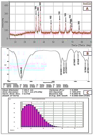 where D is the crystalline size, K is the shape constant, λ is the wavelength of the X-ray, β is the full maxima half-width and θ is the diffraction angle. This analysis was undertaken using a Shimadzu apparatus (Shimadzu Scientific Instruments (SSI), Kyoto, Japan) with a nickel filter and Cu-Ka target. Fourier-transform infrared (FTIR) analysis of biosynthesized nanoparticles was carried out using an Agilent system Cary 630 FTIR Spectrometer (Creek Blvd, Santa Clara, CA, USA). The powder of the biosynthesized nanoparticles was placed in a micro-cup with a 2 mm internal diameter and this was inserted in the FTIR set, at 26 °C ± 1 °C, and scanned with infrared in the 4000–400 cm−1 range. The resulting spectral data were compared to a reference chart to determine the functional groups that existed in the sample [87]. The particle size distribution of the biosynthesized nanoparticles was measured using a Malvern Zetasizer Instrument. Dynamic light scattering (DLS) measurements were performed between 10 and 1000 nm and the collected data were examined using the Zetasizer software version 7.11 [88].