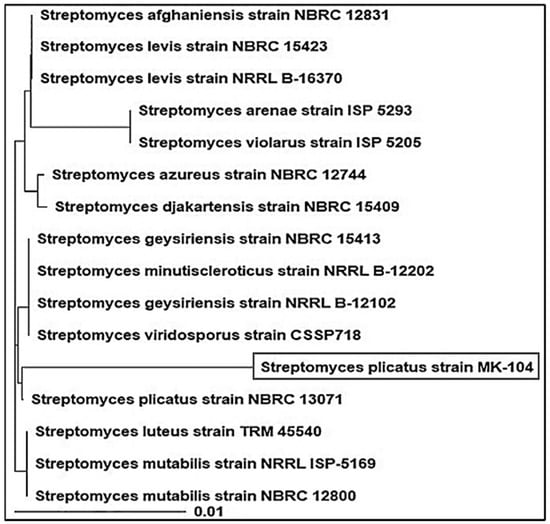 In terms of molecular characterization, MK-104′s partial 16S rRNA gene sequence (1207 bp) was matched with the Streptomyces reference species in the GenBank database to confirm the identification at the genus taxon and it was shown to be strongly related to Streptomyces plicatus strain NBRC 13071, which had a 99% 16S rRNA gene similarity matrix (Figure 5). Accordingly, actinobacterial isolate MK-104 was identified as Streptomyces plicatus strain MK-104 and was placed in GenBank with accession number MN397912; the data for this isolate are available online.