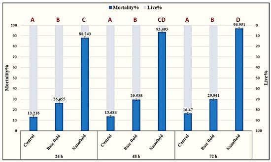 The percentages of deaths induced by ZnO-NPs after 24, 48 and 72 h of treatment; highly significant activity determined by the Tukey pairwise comparison test (p 0.05). letter “A” represent non sifnificance among control samples; ‘B” represent non significance among base fluid samples; “C & CD” represent the significance between ZnO-NPs at time 24, 48 and 72 h. the highly significant activity was denoted with the letter “D”.