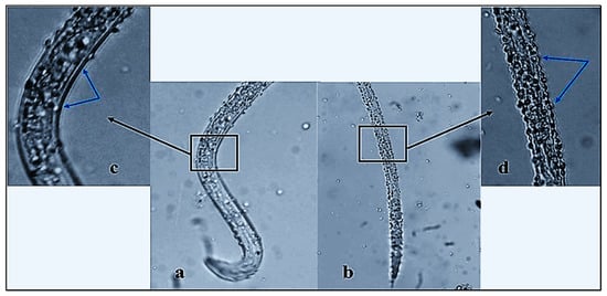 (a) The mobility (winding shape) of J2s indicates the viability and (b) the immobility (straight shape) indicates the death of J2s (300×). (c) Smooth surface of vital J2s cuticle and (d) serrated cuticle of dead J2s as a result of ZnO-NP nanofluid exposure for 72 h.