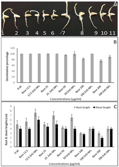 Effects of various ZnO-NP concentrations on Vicia faba. (A) The treated plants’ morphological characteristics at all concentrations—1: D.W; 2–6: base fluid dilutions; 7–11: ZnO-NP nanofluid concentrations; (B) percentages of of seed germination; (C) shoot length and root length (cm).