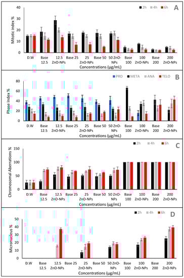 The mitotic index (MI) reduction was found to be statistically highly significant for all treatments at 6 h, with minimum values of 2.1 ± 36 and 2.5 ± 0.7% for the 200 base fluid dilution and 200 g/mL ZnO-NP nanofluid, respectively). It might be deduced that there was a direct link between increased exposure time, ZnO-NP nanofluid concentration and decreased mitotic activity. Before the application of the 100 base fluid dilution, the prophase was the most common mitotic stage for all exposure concentrations measured (Table 5). However, increasing the nanoparticle dose resulted in a significant increase in the phase index values for certain divisional levels, such as the anaphase and telophase, which peaked at 100 and 200 µg/mL ZnO-NP nanofluid, respectively (Table 5 and Figure 10B).