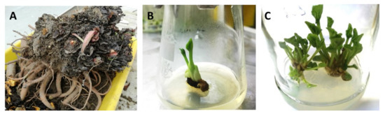 Shoot cultures were established from axillary buds isolated from dormant, eight-year-old rhizomes. First, they were divided into small parts then washed thoroughly with running tap water and soaked in fungicide. Buds were isolated and sterilized by soaking in commercial bleach (ace 4 mL/water 100 mL) for 20 min and then in 0.1% HgCl2 for 5 min. After rinsing in sterile water, the explants were placed in 50 mL Erlenmeyer flasks in Murashige and Skoog [45] (MS) medium containing different levels of nitrogen salts (100% and 75%), 100 mg·L−1 myo-inositol, vitamins (nicotinic acid, pyridoxine, thiamine (1.0 mg·L−1 each)), 2 mg·L−1 glycine, 88 mM sucrose and 6 g·L−1 agar (Biocorp, Poland). The effect of 4.4 µM benzylaminopurine (BAP) added together with 0.3 µM gibberellic acid (GA3) or 0.1 µM 1-naphthaleacetic acid (NAA) was studied. Full-strength MS medium without growth regulators was the control. The pH of the medium was adjusted to 5.8 before autoclaving. After 3 subcultures (each 3 weeks), the survival rate and the number of developed shoots were determined.