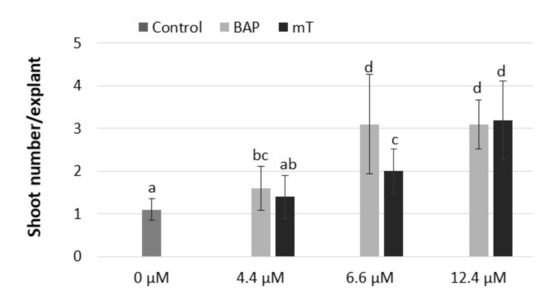 Effect of different cytokinin types (BAP, mT) and concentrations (4.4, 6.6, 12.4 µM) on shoot formation of rhubarb ‘Malinowy’ after a 4-week subculture period. Sucrose concentration in the medium was 88 mM. Medium without cytokinin was the Control. Means marked with the same letter do not differ significantly (p = 0.05) according to Duncan’s test.