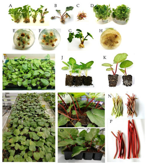 In vitro shoot formation, rooting and acclimatization of culinary rhubarb ‘Malinowy’. (A) Shoots multiplicated in mT medium containing different levels of sucrose (from the left: 59, 73, 88 and 175 mM); (B) shoots from BAP medium containing 175 mM sucrose; (C) leaf petioles from mT medium containing 175 mM sucrose; (D) shoot cultures; (E) roots three weeks after transfer to medium with 0.49 µM IBA; (F) roots three weeks after transfer to medium with 4.9 µM IBA; (G) shoots rooted in the presence of 4.9 µM IBA; (H) roots after 4 weeks in medium with 4.9 µM IBA; (I–J) plantlets four weeks after transfer to ex vitro conditions (growth room); (K–L) plantlets six weeks after transfer to the greenhouse; (M–O) plantlets nine weeks after transfer to the greenhouse; (N–P) leaf petioles after different periods of growing ex vitro.
