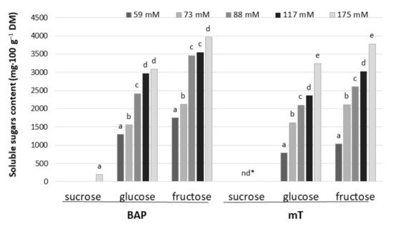 Contents of soluble sugars in culinary rhubarb ‘Malinowy’ after a 4-week subculture period in medium containing different cytokinin types: BAP (6.6 µM) and mT (12.4 µM) and sucrose levels (59, 73, 88, 117 and 175 mM); * not detectable. Duncan’s test was used independently for each type of cytokinin and sucrose concentration. Different letters indicate significant differences among sucrose treatments (p = 0.05).