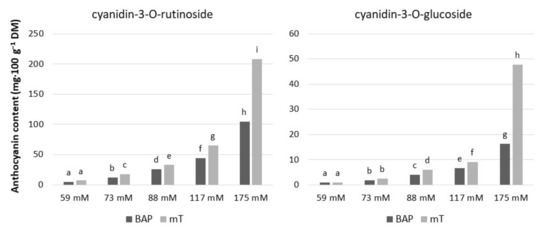 We found that exogenous sucrose levels and cytokinin type had a significant effect on anthocyanin accumulation in rhubarb ‘Malinowy’ under in vitro conditions (Figure 3A and Figure 5). The most abundant anthocyanin compound was cyanidin-3-O-rutinoside (max. 208.2 mg·100 g−1 DM), followed by cyanidin-3-O-glucoside (max. 47.7 mg·100 g−1 DM). Both cyanidin levels were enhanced in rhubarb leaf petioles by increased sucrose concentration in the medium. At a high sucrose level (175 mM), the production of anthocyanins was significantly stimulated by cytokinin. It was found that meta-topolin resulted in 50% higher content of anthocyanins in rhubarb petioles compared to BAP (Figure 5).