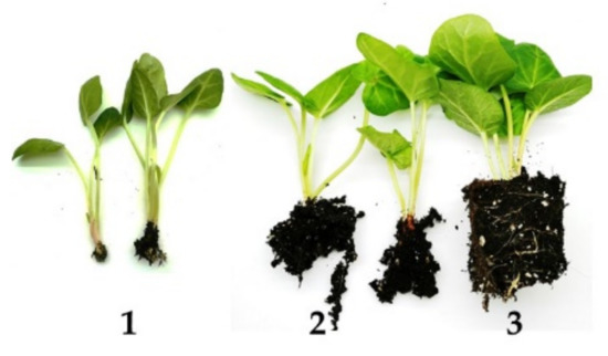 For ex vitro rooting and acclimatization, the shoots were taken directly from mT medium. The bases of shoots (approx. 4 cm long) were dipped in commercial rooting powder (Rhizopon AA 0.5%, Poland). Both types of microcutting (in vitro rooted and unrooted) were planted in multicellular trays 30 mm in diameter with a mixture of peat (Alonet Substrat, SIA Florabalt, LV-5106 Valle, Latvia) and perlite (2:1) in plastic plug boxes covered with transparent plastic caps to prevent dehydration. Ex vitro rooting and acclimatization took place in a growth room (25 ± 2 °C; PPFD—50 µmol m−2 s−1). The microcuttings were hardened by gradually decreasing air humidity. After 10 days, they were fed with 0.1% Kristalon (Yara Vlaardingen B.V., Netherlands) containing 18:18:18 (w/w/w) NPK. Four weeks after transfer to ex vitro conditions, the following data were collected: length of plantlets and the visual estimation of the root system on a three-point scale (1—no roots or single, short roots; 2—poorly developed root system, 3—well-developed root system, roots out of trays) (Figure 6).