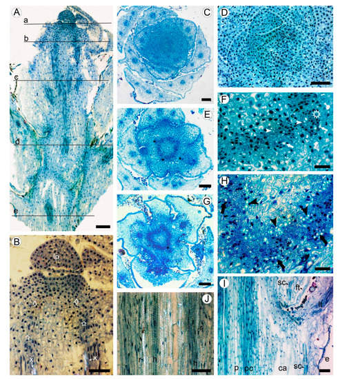 Apical meristem and primary tissues in young shoot of Aragoa corrugatifolia, light microscopy (LM). (A) Radial longitudinal section (RLS) of young shoot, approximate positions of the transverse sections (TS) shown on Figure 1C,D (a), Figure 1E,F (b), Figure 1G,H (c), Figure 11I,J (d), and Figure 2A,B (e); (B) tip of young shoot observed in partially polarized light (RLS), shoot apical meristem (SAM) with leaf primordium (lp) and peripheral zone (diamonds), procambium cells (stars), protoxylem elements (x); (C) shoot tip at the SAM level (TS), 3/8 phyllotaxis, leaf primordia with solitary leaf traces, young leaves with three vascular bundles; (D) SAM with leaf primordia (TS); (E) shoot tip just below the SAM level (TS); procambium ring, leaf traces (asterisks); (F) portion of the procambium ring shown on Figure 1E (TS), leaf trace (asterisk), protoxylem (arrowheads), and protophloem (arrows) elements; (G) young shoot in the lower portion of first elongated internode (TS), procambium ring, offset of leaf trace (asterisk). (H) Portion of the procambium ring shown on Figure 1G (TS), radial seriations of procambial cells, elements of primary xylem (arrowheads) and primary phloem (arrows); (I) stem and leaf base at the level of fifth elongated internode (RLS), procambium ring (pc), pith (p), cortical aerenchyma (ca), sclereids at the leaf base (sc), epidermis, leaf trace (lt), filiform trichome (ft); (J) portion of the procambium ring shown in Figure 1I observed in partially polarized light (RLS), tracheary elements with helical (h) and reticulate (r) patterns of secondary cell wall. Scale bars: 100 µm for (A,C,E,G), 50 µm for (B,D,I,J), 20 µm for (F,H).