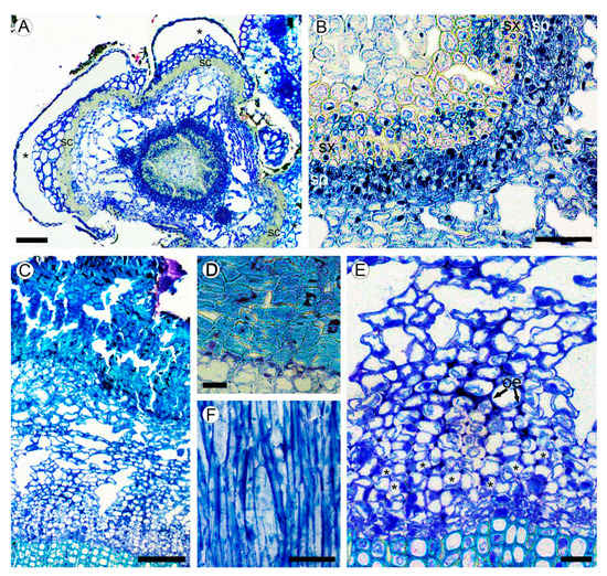 (A,B) Structure of young stem in Aragoa corrugatifolia (LM). (A) Young shoot with prominent leaf bases in the lower portion of fourth elongated internode (TS), vascular cambium with juvenile rings of secondary xylem and secondary phloem, cortical aerenchyma, leaf bases (asterisks) outlined with the bands of sclereids (sc); (B) portion of the ring of secondary conductive tissues shown in Figure 2A (TS), continuous rings of secondary xylem (sx) and secondary phloem (sp). (C–F) Structure of mature bark. (C) Secondary phloem, cortex with aerenchyma, periderm with uniseriate phelloderm, and prominent phellem made of thick-walled cell (TS); (D) Portion of periderm, phellem cells with thick sclerified walls, thin-walled phelloderm cells in one to two layers (TS); (E) portion of secondary phloem and cortical aerenchyma shown in Figure 2C (TS), sieve tubes with companion cells in radial groups (*), obliterated phloem elements (oe), large intercellular spaces in cortex; (F) tangential longitudinal section (TLS) of secondary phloem; strands of phloem axial parenchyma, lack of rays. Scale bars: 100 µm for (A,C), 50 µm for (B,F), 20 µm for (D,E).