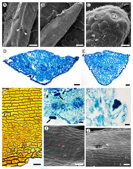 Leaf structure of Aragoa corrugatifolia. (A) Abaxial leaf side (SEM), sessile glandular trichomes (arrowheads); (B) adaxial leaf side (SEM), hydathode pore on the leaf tip; (C) hydathode pore at the leaf tip shown on Figure 3B (SEM); (D) TS of leaf in its middle portion (LM), epidermis with prominent cuticle, spongy mesophyll, three vascular bundles; (E) TS of leaf in its basal portion (LM), epidermis with prominent cuticle, spongy mesophyll, branch point of vascular bundles; (F) fragment of leaf (TS, LM), sessile glandular trichomes on adaxial and abaxial epidermis (arrows), cross sections of filiform trichomes (arrowheads); (G) stalked glandular trichome on adaxial epidermis (LM); (H) Abaxial epidermis (LM) from midrib without stomata (top) and lateral portions of leaf with anomocytic stomata (bottom). (I) Adaxial leaf side (SEM), anomocytic stomata, epidermal cells with curved anticlinal walls. (J) Midrib region on adaxial leaf side (SEM), epidermal cells with straight anticlinal walls, hollow with glandular trichome. Scale bars: 200 µm for (A,B), 50 µm for (C–E,H–J), 20 µm for (F,G).