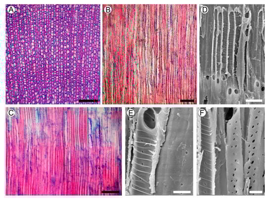 - Carlquist, S. Comparative Wood Anatomy. Systematic, Ecological, and Evolutionary Aspects of Dicotyledon Wood, 2nd ed.; Springer: Berlin/Heidelberg, Germany, 2001; pp. 1–448. [Google Scholar]