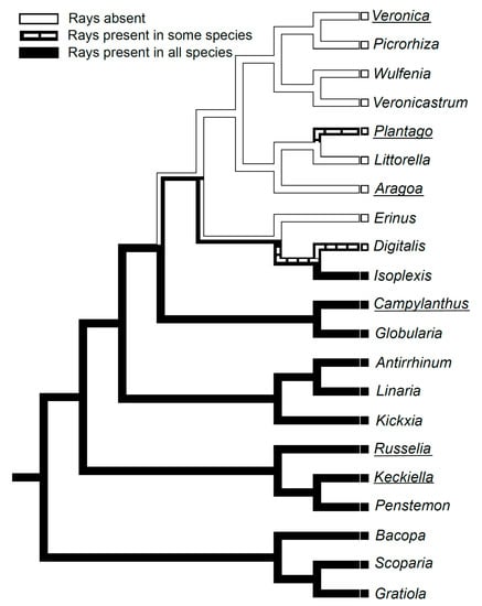 Both our observations on Aragoa, and the published wood anatomical data on other Plantaginaceae genera [11,13,14,15,17,18,19,20,21,27,29,37,38], were used to reconstruct the pattern of evolution for the raylessness within this family (Figure 5). The mapping of this trait on a subset of the most parsimonious tree of the combined analysis of one nuclear and three plastid regions [6] shows that the loss of rays is synapomorphic for the large crown clade comprising the genera Aragoa, Littorella, Plantago, Veronica, Picrorhiza, Wulfenia, and Veronicastrum, and it occurred twice independently in the genera Erinus and Digitalis, belonging to its sister lineage.